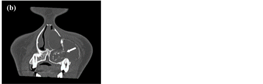 Figure 3. (a) Axial image; (b) Coronal image, anterior teeth area. (c) Coronal image, posterior teeth area. CT showed a well-defined unilocular expansile lesion with multiple radiopaque calcific specks (arrow) arising from the left maxillary alveolar ridge.