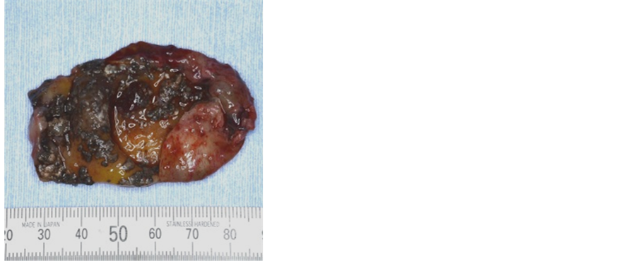 Root canal therapy followed by surgical enucleation of the cystic lesion and apicoectomy with 24, 25, 26 was carried out under general anesthesia. An intraoral approach was used, and the lesion was exposed and could be easily removed from the bone without adhesion (Figure 4). The excised tumor measured 40 × 45 mm, had a smooth surface, and was elastic soft to palpation. Sectional view showed a unicystic lesion containing calcifications in the cystic wall (Figure 5).