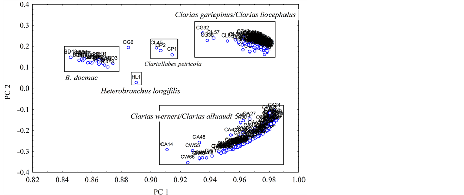 The second group of C. alluaudi/C. werneri generated by PCA did not separate into definite groups but clustered sparsely. Close examination of the results showed that the sparsely distributed C. werneri and C. alluaudi were similar morphologically. Both species are more darkish in appearance and their pectoral fin spines are serrated on the inner and outer sides. The two species occupy more or less similar habitats and share certain feeding behaviour [4] . [2] suggested that these two species are synonymous [13] ; however, have demonstrated conclusively that the two are genetically separate.
