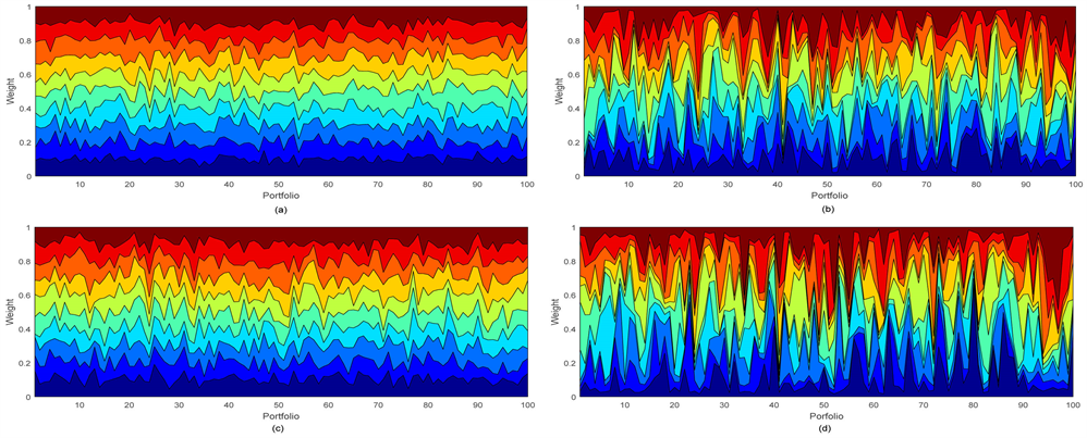 Figure 1. JPCM and MV optimized portfolio weights. This figure describes the JPCM and MV optimized portfolio weights for 100 during two periods. Subplots (a) and (b) represent the JPCM weights and MV weights respectively during first period. Subplots (c) and (d) represent the JPCM weights and MV weights respectively during second period. The horizontal axis of this chart is portfolios and the vertical axis is weights. The regions with similar color represent the same series assets in 100 samples. Seen from the chart, the variation of MV weights between two periods is bigger than that of JPCM weights. (a) CM optimized portfolio weights during first period; (b) MV optimized portfolio weights during first period; (a) CM optimized portfolio weights during second period; (a) MV optimized portfolio weights during second period.