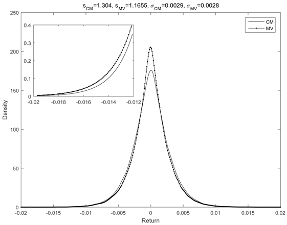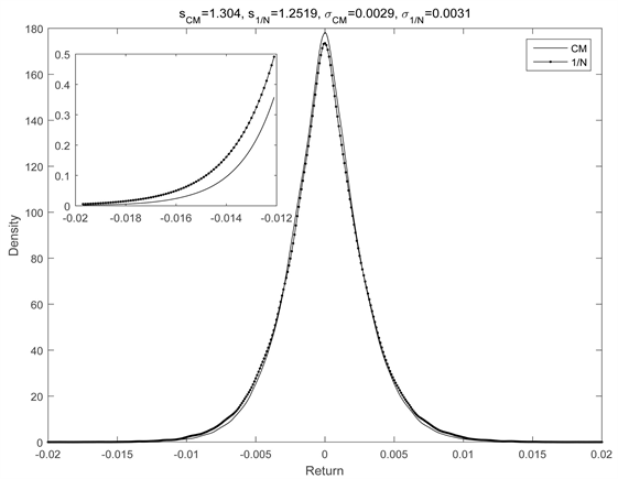 Then we show two figures about the distribution of return between three methods. Because of the space limitations, we select representative figures in our empirical results. We use the log-return of twentieth portfolios optimized by three methods as data and plot figures by fitting the distributions of these portfolios. The subplots inserted in figures are the photomicrographs of tail distribution. Although the tail distribution of JPCM model is thinner than other methods, it is difficult to tell the difference by naked eye. In Figure 2, the tail shape