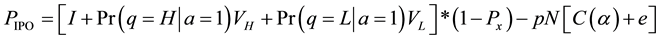 There are certain common conditions which Sherman [11] assumes for both the IPO models. The market consists of N investors who have an access to capital and information (informed investors). Since both the IPO models involve a cost of information production, investors much pay C(α) to purchase information which reveals the type of firm (either H-type or L-type) with probability of α and gives a neutral signal M with probability of (1 − α). It is assumed that the probability of receiving a false signal is zero. The mathematical properties of C(α) are: it is twice differentiable, strictly convex and strictly increasing for a value of α Î (0, 1). Apart from the cost of information, each investor faces a “fixed entry cost” of e > 0 if he wishes to participate in the IPO. Although it seems as if investors are carrying the burden of information production, these costs which ultimately reduce the equilibrium IPO price set by the firm, thus signifying that information production costs are actually borne by the issuing firm to reduce information asymmetry.