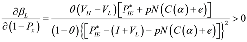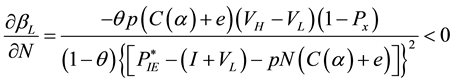 The probability of a L-type firm choosing an IPO (βL): (a) decreases when the number of potential bidders (N) in the auction increases; (b) increases when the certainty of the auction being successful (1 − Px) increases; (c) decreases when the cost of acquiring information (C(α)) increases; (d) decreases when the fixed entry cost per investor (e) increases.