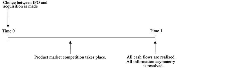 Since Bayar & Chemmanur [10] is the first and only theoretical analysis of the choice of exit between IPOs and acquisitions, we will explain their model in detail before presenting our extensions. The crucial factor driving the exit decision is product market competition. Based on the probability of success in the product market, there are two types of firms: firms with “high” probability of success (pH) or “H-type firms” and firms with “low” probability of success (pL) or “L-type firms”. The problem is set up as a one period model as shown in Figure 1. At time t = 0, the shareholders of the firm include two types of majority investors: an entrepreneur and a PE investor. The fractions of equity held by them at time t = 0 are denoted by δE and δV respectively and the fraction held by other minority investors is δO. At this stage, the firm is in need of new investment I for one or more positive NPV projects. This investment (I) can be raised in two ways, either through an IPO or through an acquisition. Both the entrepreneur and the PE investors have liquidity demands which are satisfied by a sale of a fraction of their shares, αE and αV respectively, out of their remaining initial equity holdings to public market investors who subscribe to the IPO. At time t = 1, all the cash flows from the various projects are realized and the