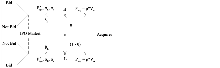After having set up the cash flows of the firm, we move on to the beliefs of the investors and strategies used by the firm. As we see, the investors believe that the proportion of H-type firms in the universe is θ. The firm takes into consideration the beliefs of the investors and sets an IPO price Pipo, along with αE and αV. The investors have to decide whether to bid for the IPO or not. It is assumed that there is no information asymmetry between the acquirer and the firm i.e. the acquirer is able to correctly assess the type of the firm. Since the acquirer has considerable bargaining power, it is assumed that he will pay only a fraction (ρ) of the intrinsic net present value of the firm (VA) to the target firm’s insiders.