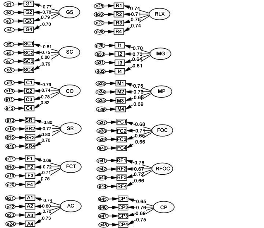 Figure 1. First order confirmatory factor analysis of the OMSAT-3 Arabic version. All parameters are significant at the 0.05 level (G1 to CP4: 48 items of OMSAT-3; e1 to e48: items errors).