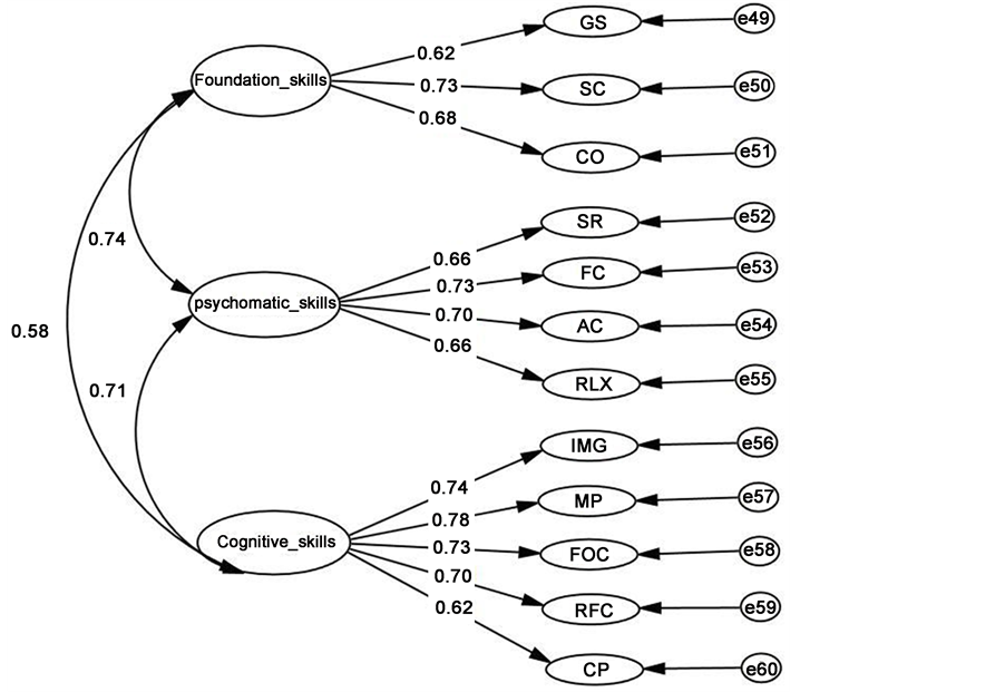 The second order CFA aimed to test the ideal model elaborated from the initial version ranging the OMSAT-3 subscales in 3 categories: 1) basic skills (goal setting, self confidence and commitment); 2) psychosomatic skills (stress reaction, fear control, relaxation and activation); 3) cognitive skills (imagery, mental practice, focusing, refocusing and competition planning).