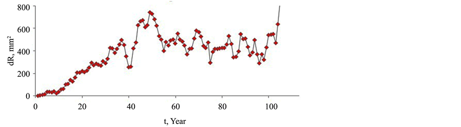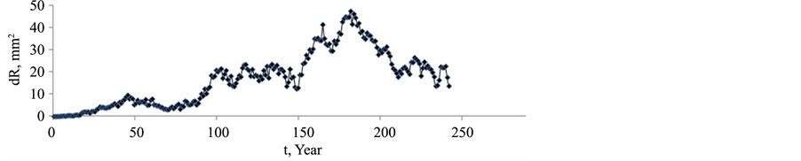 Figure 2. Comparative dendrograms for a pine-tree: width of tree rings (d), average for 15 trees (Lovelius & Kolesnikov) ; radii of rings (R), calculated with Equation (1); area of pine tree rings (dR).