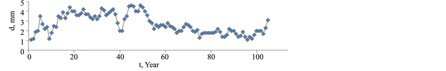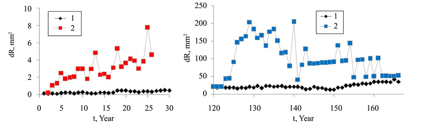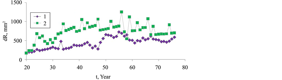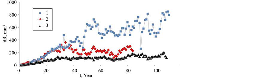 Figure 3. Dendrograms of the increments of tree-ring area for spruce (a): 1―average values of d for 23 trees (Lovelius & Kolesnikov) ; 2―spruce in fir-wood (Lovelius & Lezneva) ; 3―spruce in bilberries forest (Lovelius & Lezneva) ; and 242-year-old larch (b) (Lovelius, 2011) .