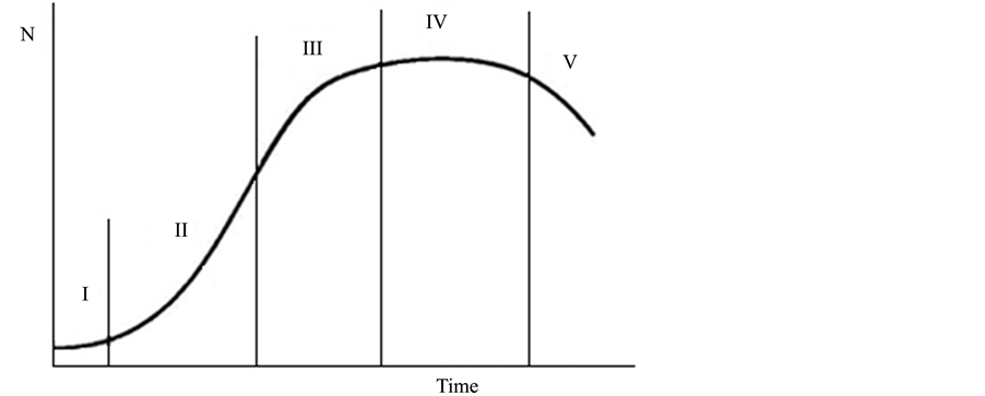 Figure 5. The growth curve of the plant, with N-the number of cells: I―lag phase, seed adaptation and initial sprouts; II―exponential phase of leaves’ and roots’ biomass growth; III―fruiting (breeding) phase; IV―stationary phase; V―degradation phase (Alechina, 2005) .