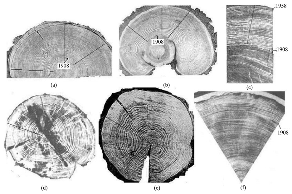 Figure 1. Cuts of trees from the Tunguska explosion zone (Site TM) . (a) is for spruce-Longo, the rest are for larches; (b) 180-; (c) 290-; (d) 35-; (e) 47-; (f) 227-year-old. Lines show the directions for dendrochronology calculations.