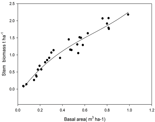 Figure 5. Relationship between Basal area m2∙ha−1, Stem volume m3∙ha−1 and stem biomass t∙ha−1. Equation: Polynomial, Cubic, R2 = 0.94. f = −0.18 + 4.596 × x + (−4.26) × x2 + 2.11 × x3.