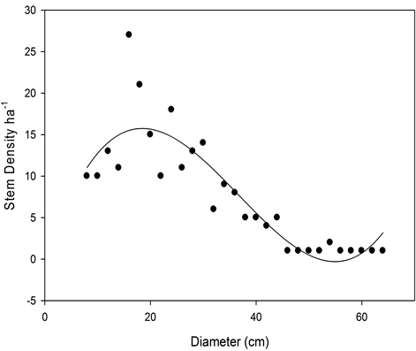 Table 1. Distribution of Stem density (ha−1), tree height (m), basal area (m2∙ha−1), stem volume (m3∙ha−1) in the respective diameter (cm) classes.