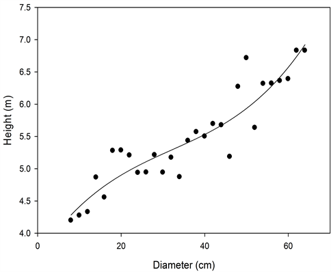 Figure 2. Relationship between tree Diameter (cm), Stem density ha−1 and tree height (m). Equation: Polynomial, Cubic, R2 = 0.86. f = 3.62 + 0.097 × x+ (−0.0021) × x2 + 2.1925E−005 × x3.