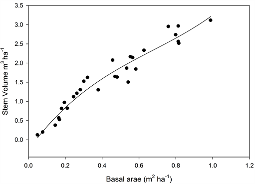 Figure 3. Relationship between Basal area m2∙ha−1, Stem volume m3∙ha−1 and stem biomass t∙ha−1. Equation: Polynomial, Cubic, R2 = 0.94. f = −0.259 + 6.56 × x+ (−6.08) × x2 + 3.027 × x3.