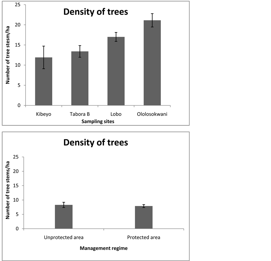 The Ololosokwani sample site from the unprotected area recorded the higher number of individuals of trees than the rest of the sampling sites (Figure 4). This was followed by Lobo and Tabora B sites in the woodlands of the protected area where the Kibeyo site in the unprotected area has lowest tree stem density (Figure 4). The comparisons among sample sites showed significant difference based on the analysis of variance (ANOVA) (F = 4.88, df = 75, P = 0.0038). However, Ololosokwani had a significantly higher tree stem density than Kibeyo (LSD = 9.214, q = 4.980, P < 0.01 and Tabora B (LSD = 7.717, q = 4.050, P < 0.05) whereas no significance difference existed between Tabora B and Lobo (from the protected) area (LSD = 3.592, q = 1.885, P > 0.05) and this applied to the rest of the pairs of data. Also higher tree stem density was observed in unprotected than in the