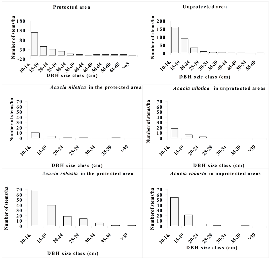 The stand size class distribution pattern among tree species showed a considerable difference between the protected and the unprotected areas such that high density was at lower sizes such that the population is characterized by individuals with DBH classes less than 24 cm (Figure 5). Both sides of the ecosystem had a population structure that displayed an inverted J-shaped curve with a high stem density at 10 - 14 cm size classes that progressively decreased with the increasing in girth sizes in both protected and the unprotected areas of the ecosystem. However, in the protected area, it was observed trees with girth sizes above 65 cm, which were absent in unprotected areas (Figure 5). Higher stem density existed at 10 - 19 cm in unprotected areas than the protected area which showed a limited recruitment at lower size classes in the later management regime. A consistently low stem density of Acacia robusta at each size class, particularly at 10 - 14 cm and 15 - 19 cm size classes which was much lower outside the protected area than in the protected area. However, it was slightly higher stem density at lower girth sizes for Acacia nilotica in unprotected area than it was in a protected area. Large stem sizes of Acacia robusta beyond 39 cm were missing in the unprotected area, but existed in the protected area Figure 5. For A. nilotica, most trees had DBH sizes below 24 cm in the unprotected area where trees beyond these sizes were found in protected area. This indicates that exploitation of large size trees occurred in unprotected areas in the Serengeti ecosystem.