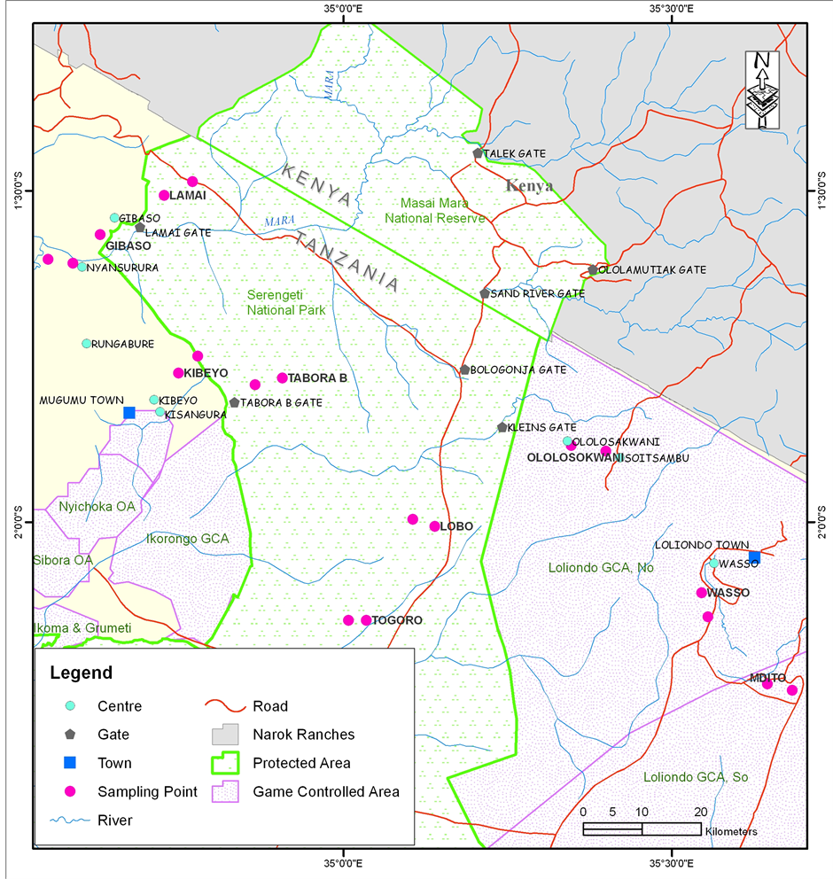 Serengeti ecosystem is located in the northern part of Tanzania and south of Kenya between longitudes 1˚30'S - 3˚20'S and latitudes 34˚00'E - 5˚15'E (Figure 1). Mara River is the largest perennial water body cutting across the ecosystem through the Kenya-Tanzania border and out of the protected area through Lamai gate to the Lake