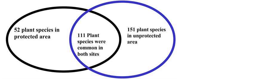 A total of 314 plant species were recorded from all study sites in Serengeti ecosystem where the unprotected area recorded higher plant species composition (262 species) than in protected (163 species) (Figure 2). However, out of the 314 plant species recorded in the ecosystem, 151 plant species were identified in unprotected area and 52 were recorded only in protected areas and 111 species were common between the two management regimes. The difference in species composition between protected and unprotected area was significant based on t-test (t = 3.54, df = 198, P = 0.005).