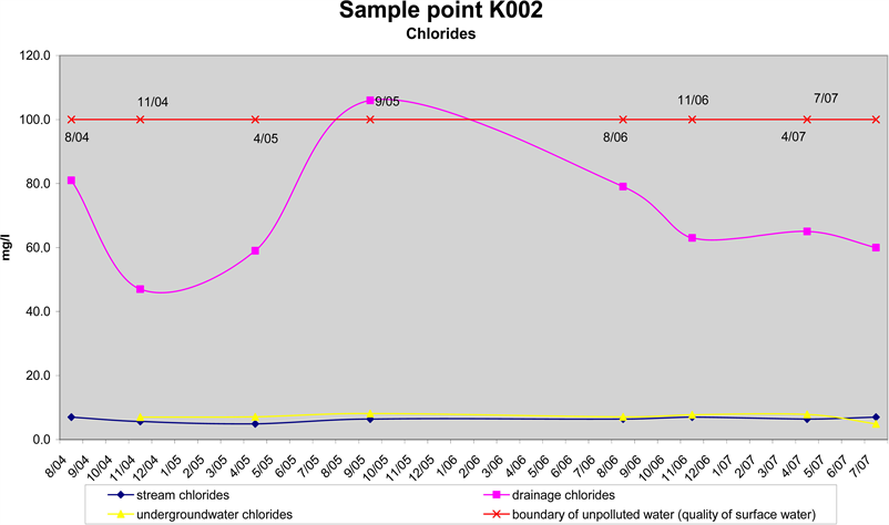At Sample Point K 002 (Železný A stream), we found, with the exception of the initial (historical) value (pH 6.5), a similar development of pH values over time as in the previous case (K 001), although the absolute pH values at K 002 are all lower than at sample point K 001. Likewise, the trends in acidity-alkalinity show a similar pattern. The concentrations of magnesium and calcium ions also display similar values and development. The overall hardness values, and their development over time, were very similar for the stream water at both points. Only the electrical conductivity - E.C. values (Figure 5) were somewhat lower compared with the E.C.values in the water of the Nivní stream. The bicarbonate concentration fluctuates between 25 mg and 40 mg /l and alkalinity fluctuates between 0.4 and 0.7 mmol/l). Their development is proportional to the changes over time in the pH values. The concentration of chlorides (Figure 6), nitrates (Figure 7), sulphates (Figure 8), and nitrites did not exceed the boundary value for slight chemical pollution of stream water. According to the phosphate concentration (Figure 9), in August 2006 and April 2007, the stream water falls into the category of very heavily polluted. In the preceding samples, and the subsequent one collected in July 2007, the phosphate concentration in the stream water was, however, below the level of slight pollution. With the exception of the period with a higher phosphate concentration, the water is unpolluted.