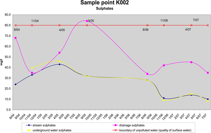 increased considerably (especially in the more recent samples) in correlation with the increase in the concentration of magnesium and calcium ions (Figure 3). However, not even these increased values reach the critical level for assigning this water to the “slightly polluted” category. The same applies to electrical conductivity values. Even the highest measured value (333 mS/cm) does not exceed the limit value for slight pollution (40 mS/m), although it has, on average, three times the electrical conductivity value measured in the nearest watercourse [1] . In connection with the increase in alkalinity, there was an increase in bicarbonate content (within the range of 60 - 100 mg /l). However, the concentration of sulphates in the drainage water has not increased much in comparison with those in the stream water. Similarly, chloride content (on average approximately 10 mg/l) decreased at first, then, in the later samples, it gradually increased. In neither of these cases, however, were the concentrations great enough to confirm the pollution of the drainage water, nor did the concentration of K+ ions in the drainage water differ much from the content in the surface water. It fluctuated inconclusively between 2 and 4 mg K+/l. According to the phosphate concentration, the drainage water quality falls into category II. (“slightly polluted”).