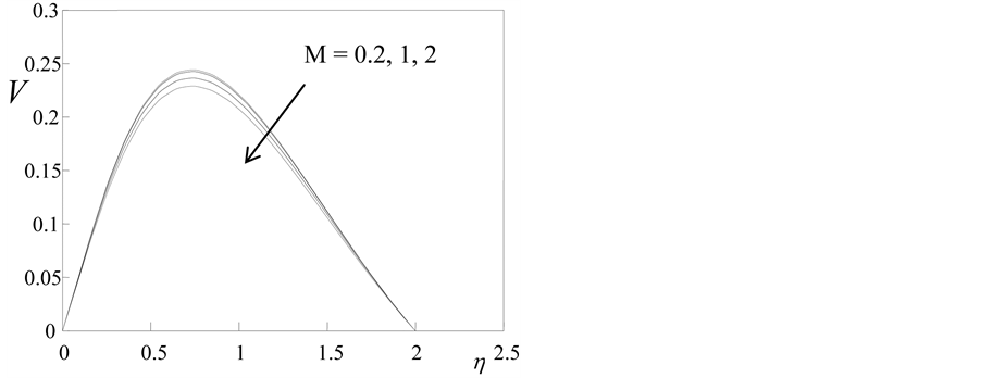 Figure 2. Effect of magnetic parameter M on the primary flow velocity V.