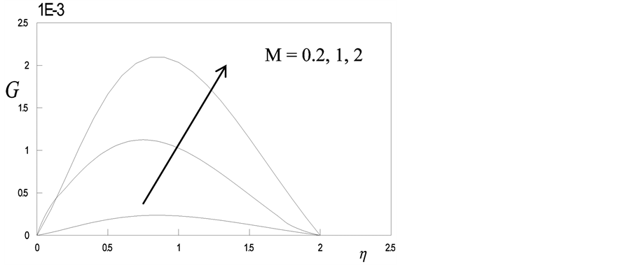 Figure 3. Effect of magnetic parameter M on the secondary flow velocity G.