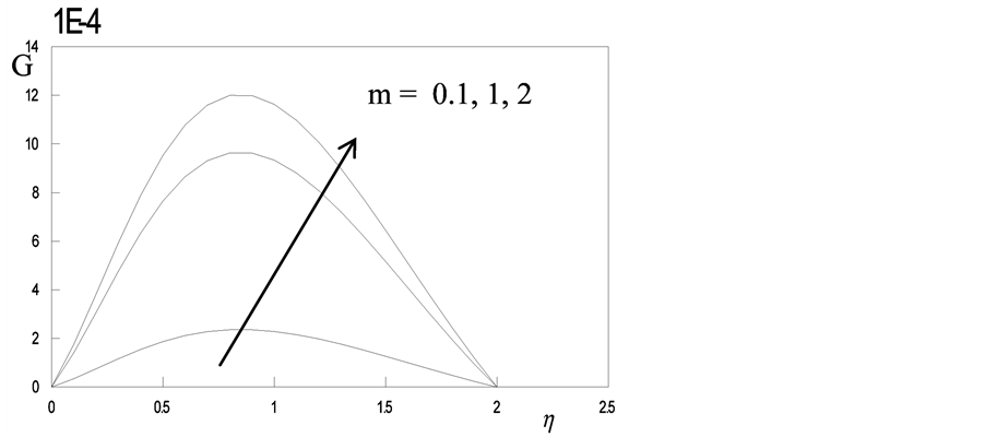 Figure 2 and Figure 3 show the effect of the magnetic field parameter on the velocity and temperature profiles within the boundary layer. In which the increasing of the magnetic field parameter is to decrease the dimensionless primary flow velocity and increases the dimensionless secondary flow velocity. The decreasing of due to the increasing of the Lorentz force, which opposes the flow. The increasing of Hall parameter m increases the secondary flow velocity as shown in Figure 4. Form Figures 5-7 it is observed that the dimensionless velocities and g increase while the dimensionless temperature decreases as the density -temperature parameter increases. An increase in the density temperature parameter means an increase of the velocity in the fluid particles due to an increase in the buoyancy forces (the density variation with temperature increases). Hence as n increases the fluid will be under two forces: the first force increase the velocityies of the fluid due to the increase in the buoyancy forces and the second force decrease the velocities of the fluid due to the decrease in the temperature.