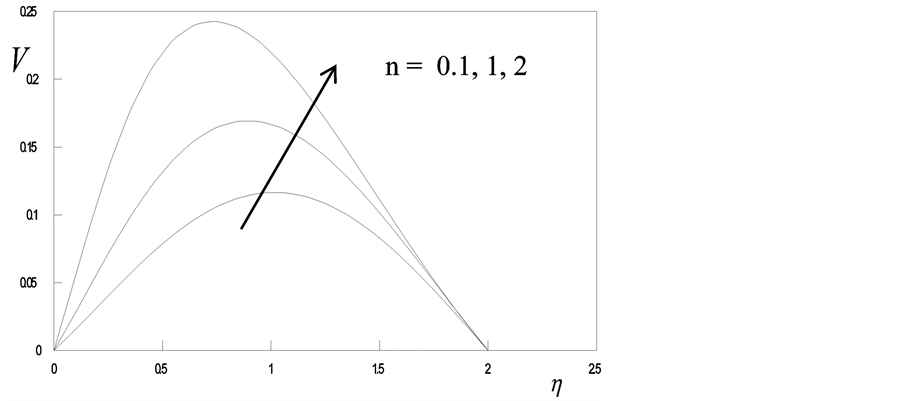Figure 5. Effect of the parameter n on the primary flow velocity V.