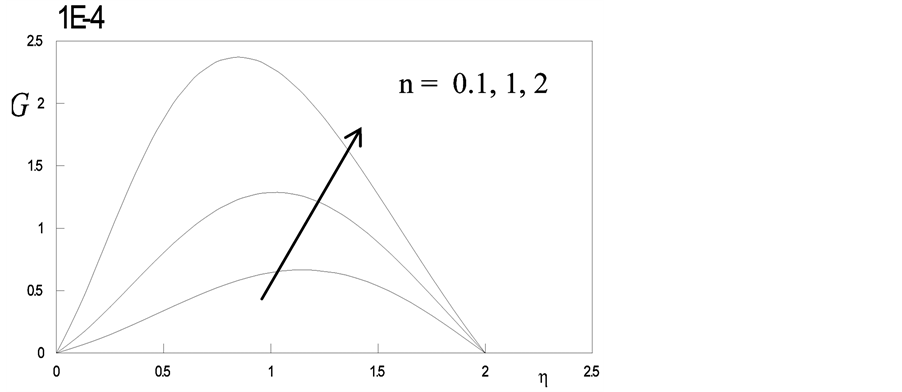 Figure 6. Effect of the parameter n on the secondary flow velocity G.