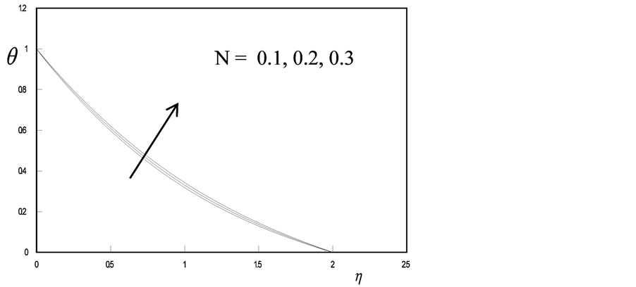 Figure 8 presents typical profiles for the velocity for different values of the radiation parameter. The increasing of the radiation parameter is to increase the dimensionless velocity. This increasing also increase the secondary flow velocity and temperature. This is can be explained by the fact that the effect of radiation is to