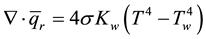 For an optically thick gas, the gas self-absorption rises and the situation becomes difficult. However, the problem can be simplified by using the Rosseland approximation [19] , which relates the radiative heat flux to the gradient of the total emissive power of the gray gas as follows,