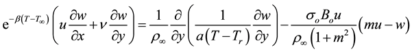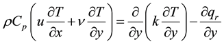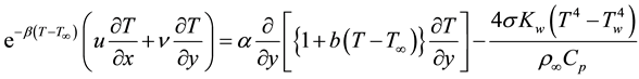 The viscous dissipation; the radiative heat flux in the -direction, in comparison to the -direction; and the velocity of the gas far away from the plate are assumed to be negligible.