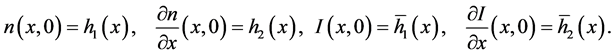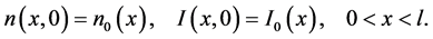 In this paper, an initial value boundary problem (IVBP) of system of two linear wave equations with nonlinear boundary conditions has been considered. Solutions of this problem describes the propagation of density of optical radiation (on a given frequency) and electron carriers in one-dimensional in the ideal semiconductor rod with optical defects at the ends. For example, the corresponding mathematical model describes the wave distributions of the density of radiation of photons and electron density in an ideal semiconductor. The semiconductor is confined by two flat walls which emit or absorb light. The probability of absorption or emission of photons depend on the surface density of the radiation and the surface density of electrons in a nonlinear manner. Diffusion in semiconductors is one-dimensional and one is directed orthogonal to the flat walls. Thus, the initial boundary value problem for the two linear wave type equations with nonlinear boundary conditions will be considered. This problem models different optical phenomena as white and black solitons, propagation of light in resonator with feedback connection between beams at walls and so on.