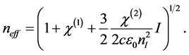 Indeed, as noted in [10] : “the nonlinear effects in optical fiber occur either due to intensity dependence of refractive index of the medium or due to inelastic-scattering phenomenon”. There are various types of nonlinear effects based on self-phase modu- lation, cross-phase modulations and four-wave mixing. We consider the effect when the refractive index is the nonlinear function of the optical intensity. The power dependence describes the Kerr-effect [10] . Origin of nonlinearity is the unharmonic motion of electrons under the action of the polarization