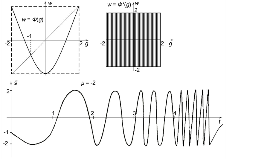 Figure 1. Solutions of turbulent type with the limit cantor set of points of discontinuities on a period. Phase portrait for simplest solutions of relaxation type (white and black solitons).