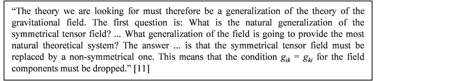 Anyhow, if we follow Einstein’s proposal at this point to account for a classical unified field theory of the gravitational and electromagnetic fields with the conceptual unification of the gravitational and electromagnetic field into one single and unique hyper-field [12] , it appears to be necessary and justified on a foundational level to concentrate at the heart of general relativity, the crucial mathematical concept of the metric tensor field gµv.