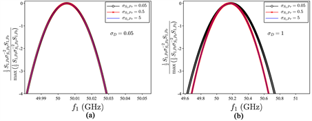 Figure 4. Ratio of exponent to its maximum dependent on frequency and keeping constant prior standard deviation . For the data set with low noise level ( , left), the peaking is more narrow than the one for the high noise level ( , right). The maximum location and the width of the ratio are used to estimate posterior mean and standard deviation . (a) Ratio for low noise data set at three values of . For , GHz and MHz are extracted which are consistent with 50 GHz used to simulate the data; (b) Ratio for high noise data set at three values of . For , GHz and MHz are estimated. and the deviation of from 50 GHz increase with the noise level. Furthermore, small prior values for affect .