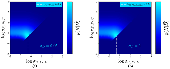 Figure 6. Model posterior . The stated model uses a uniform prior for the prior standard deviation in the domain from to . As these limits approach for and 0.501 for (dashed-white), the posterior increases. Thereby, is closely linked with the original amplitude S = 0.5. (a) Low noise case ; (b) High noise case .