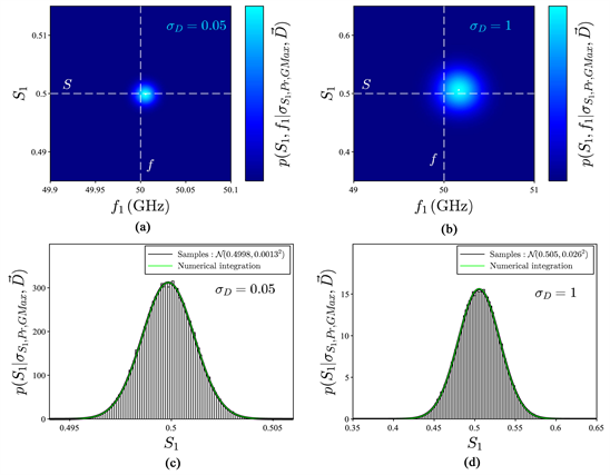 Figure 7. Joint posterior and marginal posterior of frequency and amplitude for low noise ( , left) and high noise data set ( , right). The joint posterior peaks close to the original values S = 0.5 and f = 50 GHz used to simulate the data sets. For the higher noise level, the posterior width increases, and the location of the global maximum separates further from S and f. By numerical integration, the marginal is evaluated, and its shape is close to a normal distribution. This is confirmed by a second approach which uses 105 samples from the joint posterior to estimate the marginal posterior mean and standard deviation for . The histogram of the samples is given as well. (a) for low noise level; (b) for high noise level; (c) for low noise level. The marginal mean and standard deviation read 0.4998 and 0.0013, respectively; (d) for high noise level. One finds that the marginal mean and standard deviation account for 0.505 and 0.026, respectively.