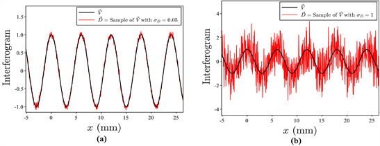 Figure 1. Simulated interferograms (without noise, black) and (with noise, red). Formally, was used with amplitude , frequency f = 50 GHz, and optical path difference grid x with increment (number of data points ). The data-like quantity resembles a sample of , assuming a Gaussian noise component with variance . Furthermore, the noise is chosen to be independent of x. (a) (low noise); (b) (high noise).