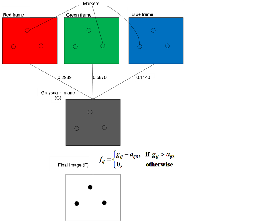 , contain the pixel values (intensity) of the whole image including the markers. The markers are assumed to be uniformly colored objects. Since the human body lacks uniform coloring, small uniformly colored stickers are assumed to be present on the relevant body part. This is considered as a tracking feature. This aids in segmenting an image more efficiently, reducing noise in the images. Considering blue stickers as markers, the blue frame would have higher numerical pixel values for the marker locations than red or green frames (
