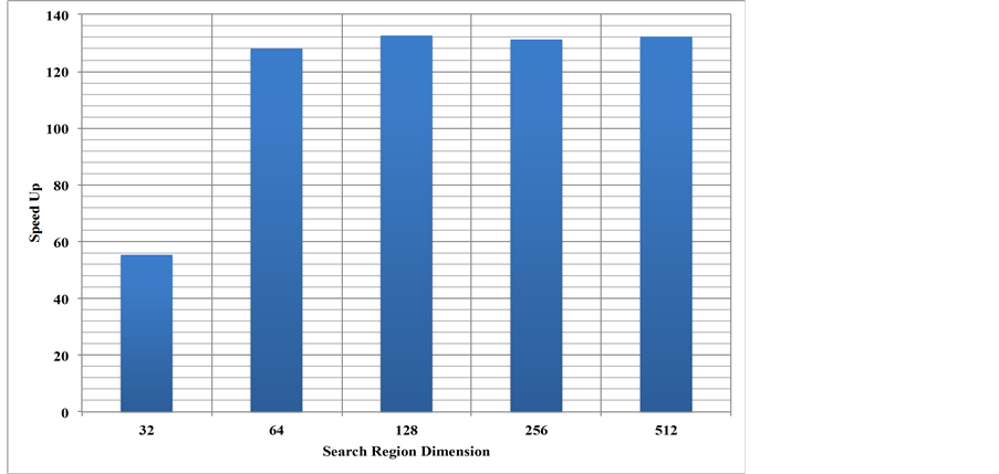 The implementation for MKA’s SSD operation can be written such that it uses different amount of register and shared memory. For example, the elements of the search region can be completely put on shared memory or a row or column of the search dimension can be moved to register memory. As such the blocks and threads will vary based on the implementation. While the memory access latency on shared memory is higher than register memory, the execution time for code using shared memory or shared and register memory combination are comparable. For this paper, the code was written to minimize the number of registers and maximize the shared memory, since this resulted in a cleaner and single source code for different search region dimensions without compromising much of performance. Using the minimized registers code and using NVIDIA profiler to determine the total amount of shared and register memory, the number of threads per block and the number of blocks was determined using Equations 28 and 30 respectively in [19] for each search region. In general, the number of threads per block was found to be 256 for search dimensions having less than 2000 pixels and 512 for search dimensions having more than 2000 pixels. The number of blocks varied based on the search region dimension.