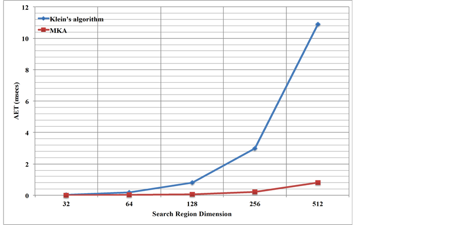 lized using standard libraries. Similar the sequential version, the parallel MKA performs better than Klein’s algorithm. This is to be expected due to the difference in the number of computations in both algorithms, as mentioned before. As the search region dimension region increases, the AET of Klein’s algorithm increases non-linearly. This is because of the higher amount of a) computations and b) data transfers occurring between library calls. For MKA, these are much lower, providing a near linear increase in AET.