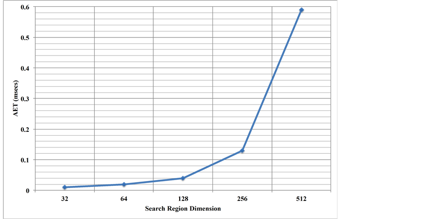 We use execution time as a measure of performance. Low execution time is considered to be better. Each implementation of an algorithm for a given search dimension is considered as one simulation and the execution time is collected. Each simulation is executed one thousand times and AET is computed. The standard deviation of AET for all simulations was observed to be under 6.5%. Each simulation has been verified by manually inspecting the tracked positions on the image. Data, for verification of algorithms, is taken from videos under indoor computer lab conditions using 60fps at 1080p resolution. For the tracking algorithm, the marker size is generally small and the search region varies from image to image. For the simulations,