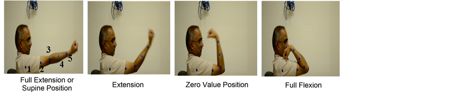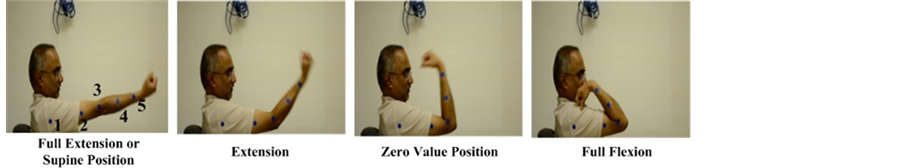 The video frames of a patient performing the elbow flexion and extension exercise shown in Figure 2 is presented again for the completion. In Figure X, the patient elbow has five markers stuck on the hand, which are tracked by the HMCS. The patient in Figure 12, starts at full extension or supine position and bends the elbow to reach the full flexion position.