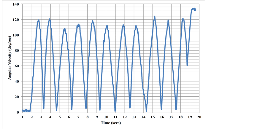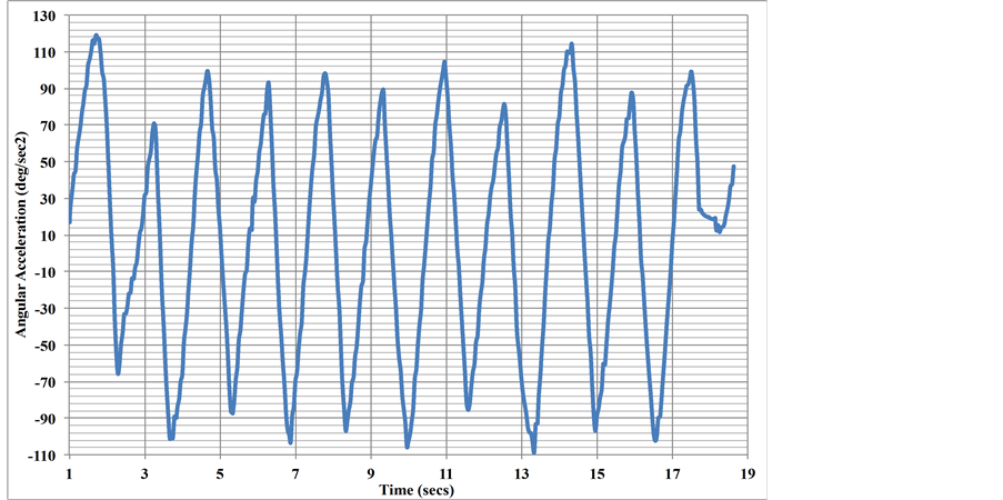 In Figure 14, it can be seen that the patient is performing the elbow motion with a significantly large variation in angular velocity and correspondingly with an angular acceleration and deceleration as shown in Figure 15. The large variation in angular velocity indicates the patient is not performing the exercises at a sustained rate. Varying angular acceleration indicates the patient having to exert different forces during the flexion and extension parts of the elbow PTE. Using the angular velocity and acceleration/deceleration data, a PT can now provide a feedback to the patient in real-time about whether the motion is smooth or jerky
