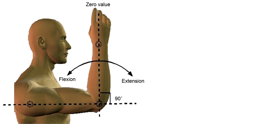 The patient when performing the elbow exercise is expected to maintain the arm (structure between shoulder and elbow joint) rigid and at the horizontal position. The ROM is measured from the zero value position. The ROM angle for flexion is measured ranging from 0˚ to +90˚ to the left of the zero value position. The ROM angle for extension is 0˚ to −90˚ to the right of the zero value position. Using the HMCS, the markers are tracked in Figure X between subsequent