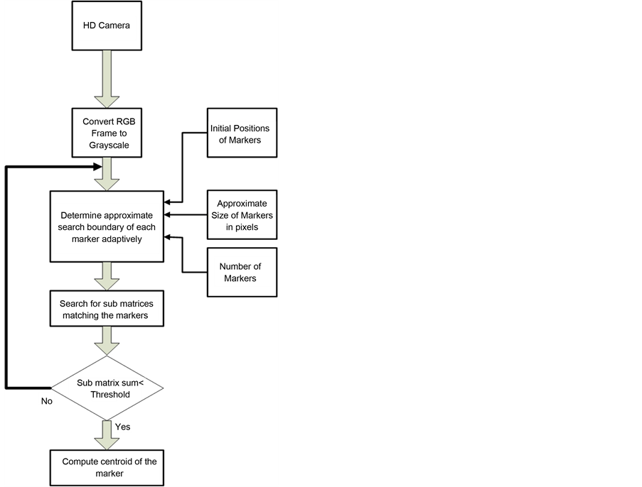 In Figure 4, the loop represents the modified Klein’s tracking algorithm, which is executed in parallel for each marker on a GPU. The first input to the algorithm is the initial position of the markers, which is located approximately at the center of a marker determined visually by a mouse click. The second and the third inputs are the size of a marker in pixels and the number of markers. The output of the algorithm is the centroid of the markers in each video frame. The Klein’s and MKA for tracking human body are discussed in detail in the following section.