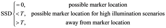 In order to find a marker, a search template (s) is used. The squared summation of the difference (SSD) between each element of the